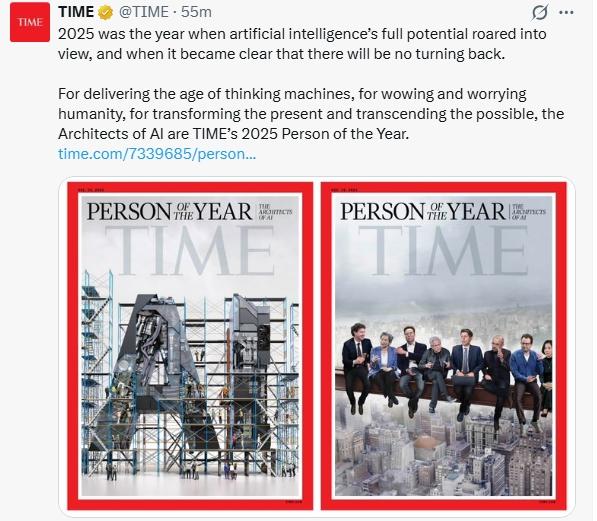 ‘AI的缔制者们’被选为《时代》2025年年度人物。2025年是人工智能潜力全面迸发且无可回头的一年。让全人类惊讶亦忧愁、改变当下并冲破可能性的边界,本地时间11日,”《时代》周刊正在社交上称,《时代》周刊暗示,“人工智能(AI)缔制者们”被美国《时代》周刊评为2025年年度人物。中新网12月11日电 据报道,