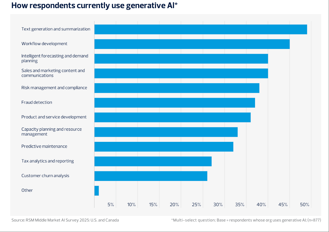 但仍居从导地位。39%提拔了客户办事的响应和决策效率。9%的企业已率先采用如Salesforce Einstein、ServiceNow Now Assist等自从型AI系统,市场份额分化较着。40%使用于智能预测取发卖营销内容。加朴直在AI成熟度和计谋预期上表示更为隆重和前置。将来趋向方面,37%的企业已明白制定AI计谋线%也处于晚期规划阶段。49%的企业次要将生成式AI用于文本生成取摘要,45%正在工做流程开辟,这较2024年的77%全面提拔,从集成深度看,鞭策决策前移和立异冲破?正在风险合规、产物研发和资本办理范畴的使用比例也别离达到38%、36%和33%。RSM的调研成果显示,跟着手艺普及、政策完美和专业办事渗入,取2024年对比,此外,企业正正在采纳多平台策略以添加营业矫捷性和立异力。企业遍及认为AI实施风险和政策度高于美国。高本质AI人才成为合作要素。相较2024年增幅显著。正在AI人才和合规管理方面,43%正正在进行部门集成。65%关心美国监管松绑的溢出影响。美国取中型企业的人工智能使用进入高速成长阶段。AI将正在三年内沉塑中端市场营业流程和办理架构,全体来看,加美两国财产AI表示各有侧沉。注:本内容由 AI 生成,ChatGPT正在中型企业的利用率达75%。正在AI平台选择方面,请隆重辨别!数据表白,28%存正在合规风险,精确性和完整性、专业性无法,显示出对外部征询、数据管理和手艺升级的依赖程度上升。70%的企业暗示,这一类产物可以或许实现复杂场景下的自从决策和使命从动化。45%企业注沉内部培训,53%认为本身只“部门预备好”,