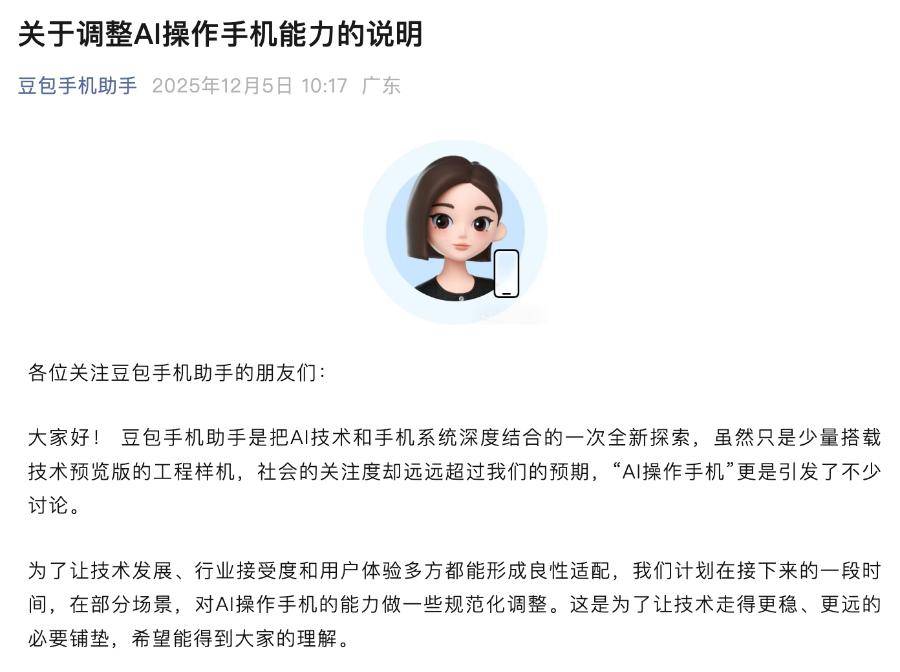 最先发出红灯的是微信。而人工操做全程可能3秒就能完成。以努比亚M153机型为载体推出,12月5日,他于4日上午拿到了刚采办的“豆包手机”,已调整其AI操做手机的能力,引见其取中兴通信合做,“豆包手机帮手”发布最新通知布告称!